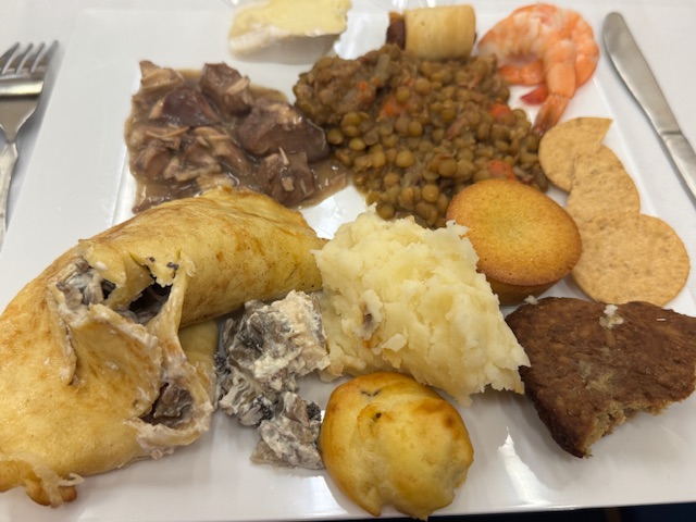 Mais voici toute l’assiette. Certains autres ont du talent ! Les lentilles étaient très similaire à notre recette de lentilles du Puy. C’est du coq au vin en haut à gauche — c’était super. La purée de pommes de terre au centre ? Une merveille.