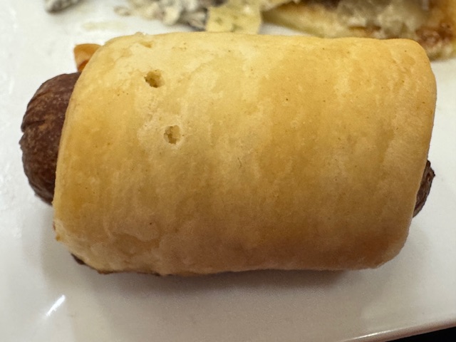 Mais en haut de la photo, il y a un petit truc d’américain que vous ne reconnaissez certainement pas, à moins que vous n’étiez passé du temps aux États-Unis. C’est une amuse-bouche dite « pig in a blanket » (cochon sous sa couverture). J’ai pris deux photos de proche pour vous amuser :
