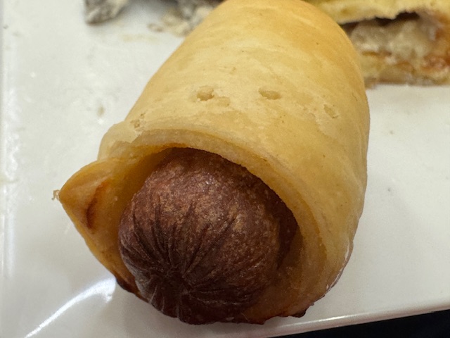 C’est un petit hot-dog, emballé dans de la pâte brisée ou de la pâte feuilletée — cette fois, c’est la pâte brisée. Vous voyez ? On a bel et bien adapté des techniques bien françaises ! On dirait que c’est notre idée d’un saucisson brioché.
