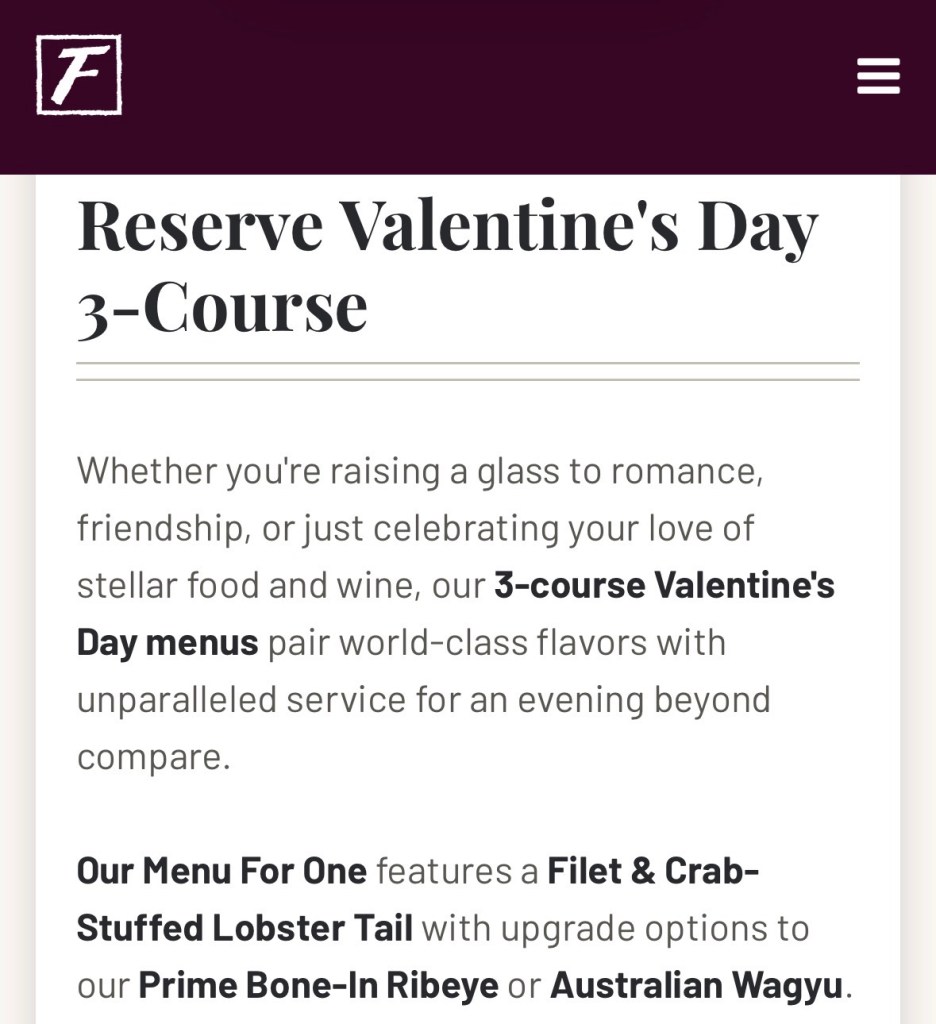 Le gros-titre dit « Réservez la Saint-Valentin 3 plats ». Le début de la phrase suivante a failli me faire une crise cardiaque. « Que vous leviez un verre soit à la romance soit à l’amitié soit juste à votre amour de la bonne nourriture et du bon vin… » Quoi ? Vous voulez me dire que pour la Saint-Valentin, je ne suis pas être obligé d’y aller en couple ? Mais ça continue : « Notre carte pour une personne met en vedette un filet et une queue de homard farcie au crabe… »