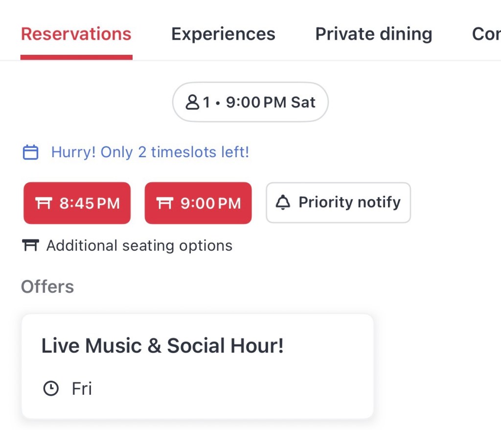 Vous pouvez voir qu’il ne reste que deux places le 14 pour 1 personne, à 20h45 et à 21h. Mais nous ne sommes pas limités au bar ou à la terrasse — la capture d’écran à droit montre que je peux choisir la salle à manger, non seulement la terrasse !