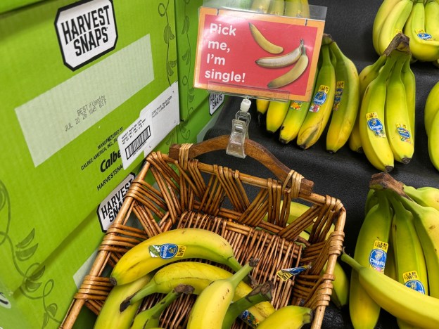 Ça dit « Pick me, je suis célibataire. » Évidemment, ce sont des bananes individuelles dans le panier au-dessous du panneau, mais tel est le sens de l’humour des employés.