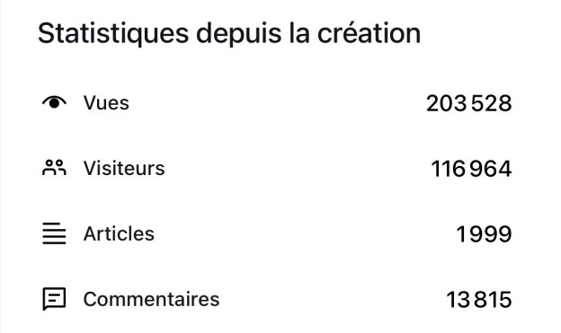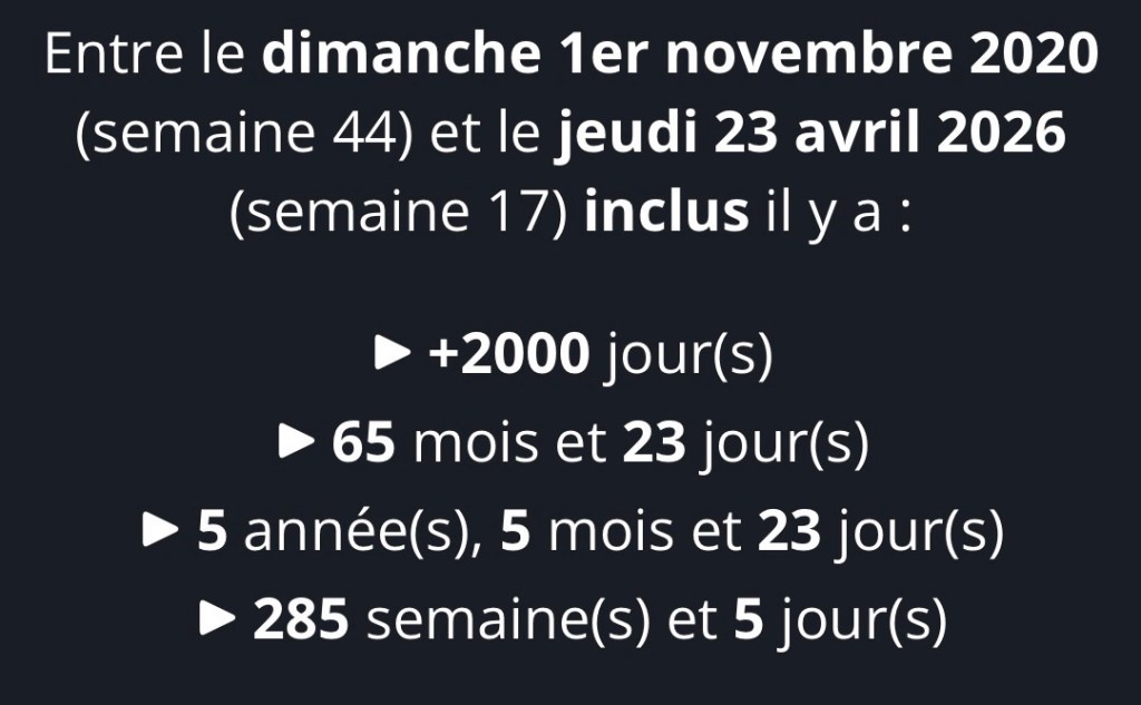 À noter, en moyen, je n’ai jamais raté un jour, mais ce n’est pas vrai — j’ai raté peut-être une vingtaine pendant tout ce temps. Mais aujourd’hui, on est aussi à 2 000 jours depuis la première publication :