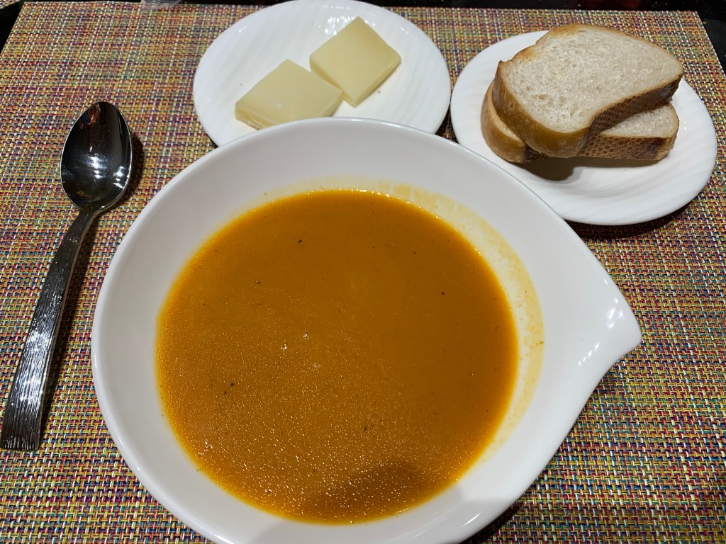 Mais il y a encore deux plats typiques de l’Ain ici. Tout d’abord, la soupe bressane au potiron, qu’on fait avec du potiron, du beurre, et du poireau. Dans l’Ain, cette soupe est servie avec des pâtes cuites au lait, mais j’avais déjà du pain, et je ne savais pas que j’allais brûler mon gâteau.