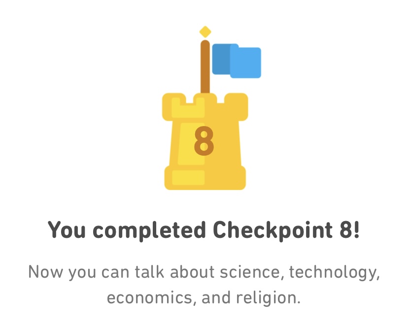 Aujourd’hui, c’est mon anniversaire et j’ai réussi – en partie – à terminer un grand projet. J’ai commencé à étudier le français le 29 mars. À l’époque, Duolingo avait 8 étapes pour apprendre le français. C’était mon objectif de finir aujourd’hui. Mais il y a un mois, ils ont ajouté une neuvième étape. C’est trop difficile – mais je viens juste d’atteindre mon objectif initial. La preuve: