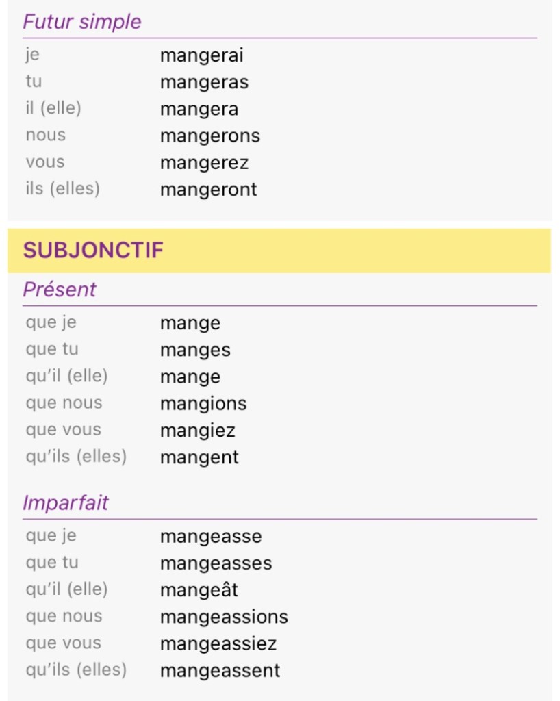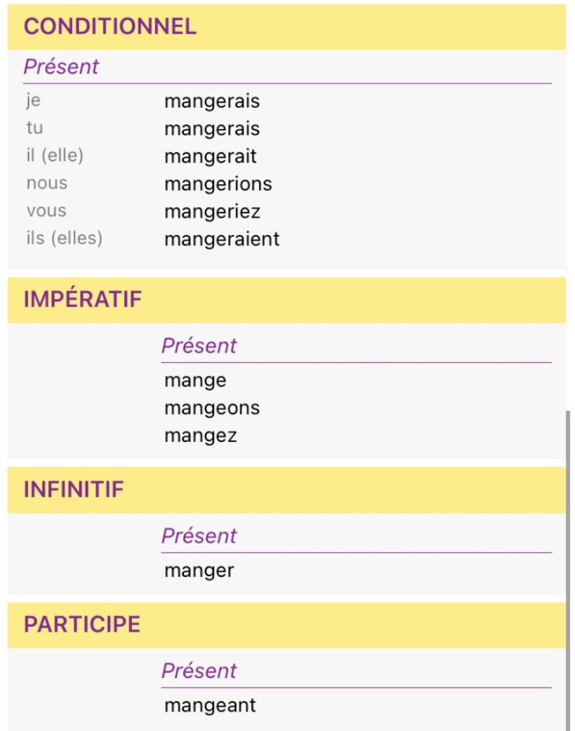 Je pense que je finirai tout dans 1-2 mois de plus. Ensuite, j’utiliserai Kwiziq, qui peut vous aider à devenir C1 (c’est mon but). Mais pendant ce temps, un ami m’a donné l’idée d’acheter la Bescherelle. C’est un bon marché sur iTunes — il ne coûte que $4. C’est aussi intimidant! Voici un exemple de toutes les conjugaisons: