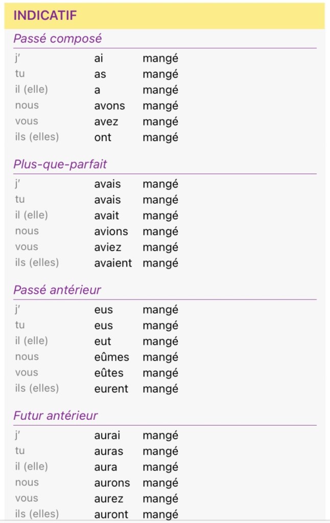 «Aie mangé»? Aïe, aïe, aïe! Je connais bien 8 conjugaisons, et j’en connais 2 un peu plus, mais il y en a 21 ici!