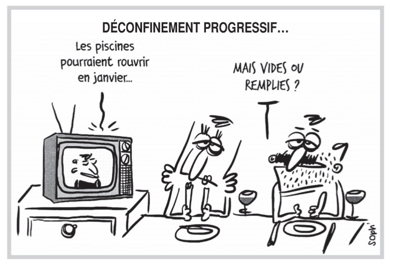 Notre dessin de la semaine traite du sujet préféré de tout le monde, la prochaine déconfinement. Quand est-ce qu’elle arrivera? Et quand ça arrive, sera-t-elle réel? J’ai besoin du gymnase pour la santé, et il me manque en ce moment, alors je trouve ce dessin vraiment sympathique.