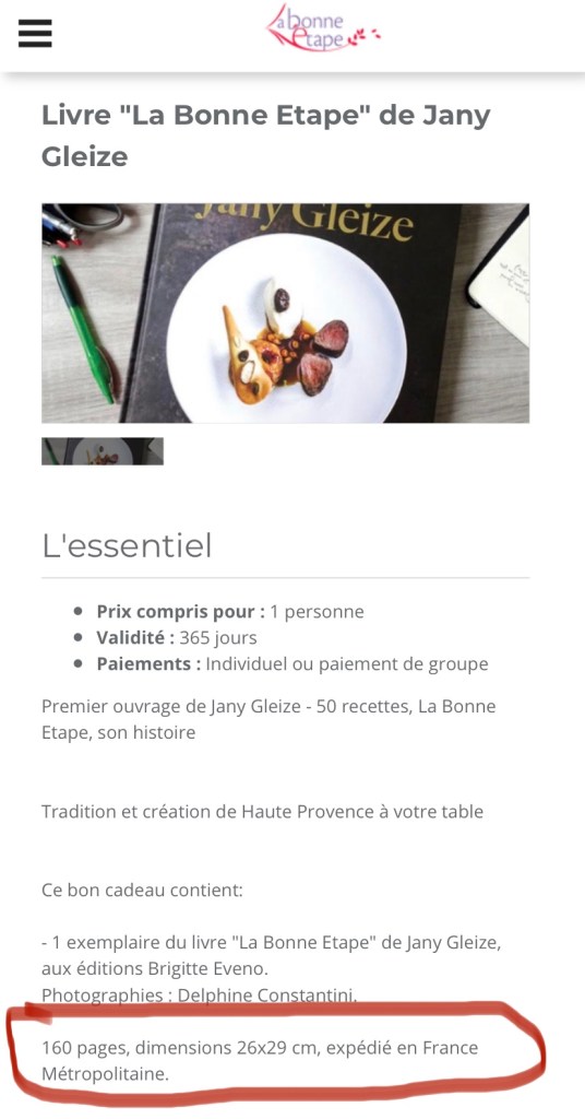 Plus tôt cette semaine, j’ai trouvé un hôtel vraiment beau dans les Alpes-de-Haute-Provence. J’ai essayé de commander leur livre de recettes. Hélas, part deux: