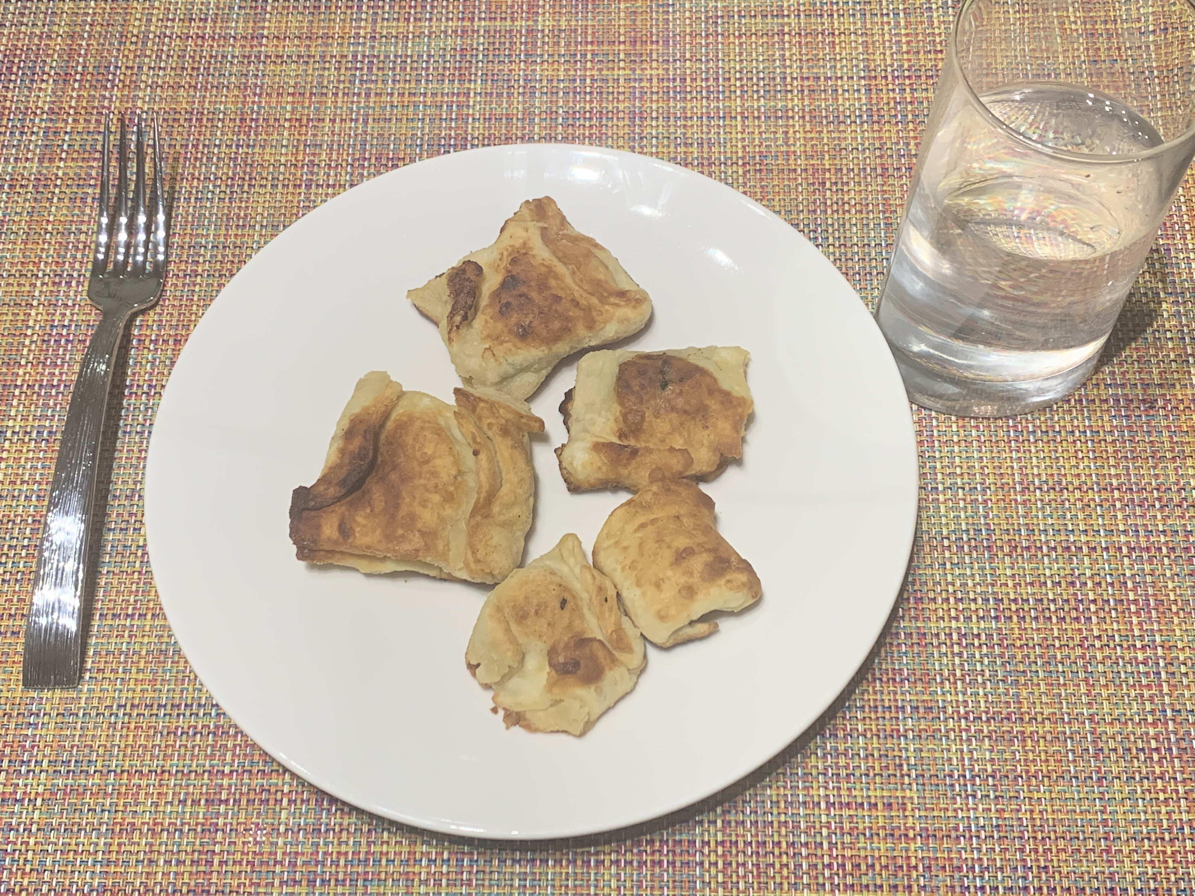 En plat principal, j’ai fait des rissoles, qui proviennent d’une recette offerte par la chaîne Arte. Les rissoles sont «des ravioles frites farcies avec de la purée de pommes de terre». Voici la recette selon Arte, avec mes astuces: