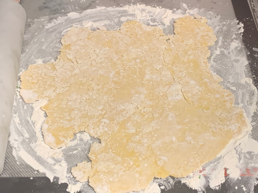 Étaler la pâte en fine couche sur un plan de travail fariné. À l’aide d’une cuillère, déposer sur la partie inférieure de la pâte des petits tas de farce, distants d’environ 10 cm. Replier soigneusement la partie supérieure de la pâte et presser fermement, même entre les tas de farce. Découper ensuite les rissoles et presser de nouveau les bords. — Ma pâte restait encore trop friable, alors je n’ai pas bien étalé la pâte. Avec une pâte bien étalé, cette recette serait PARFAIT.