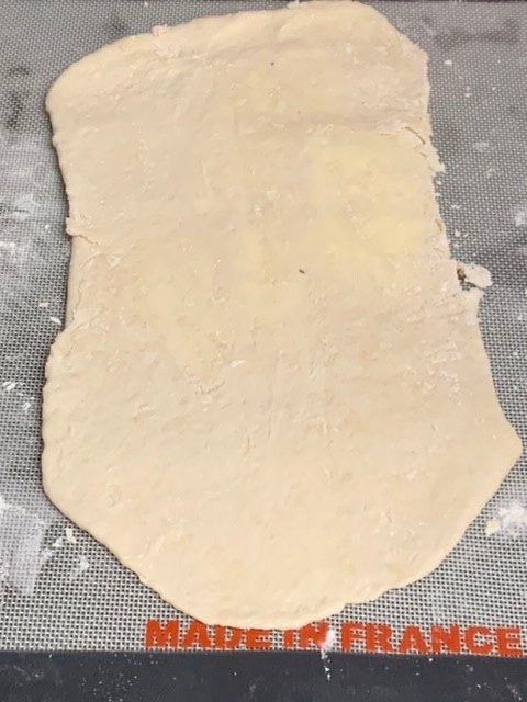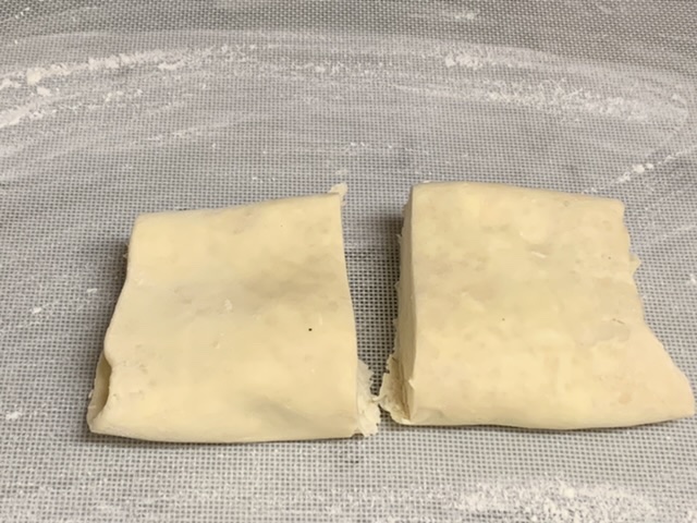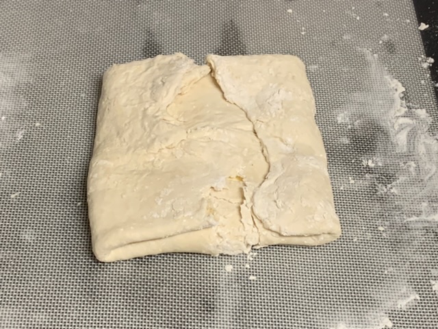 - Faire un portefeuille avec la pâte, et le beurre dedans. Rouler la pâte jusqu’à c’est 3 fois plus longue que large. Plier comme les photos et le mettre au frigo pendant 30 minutes.