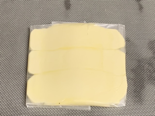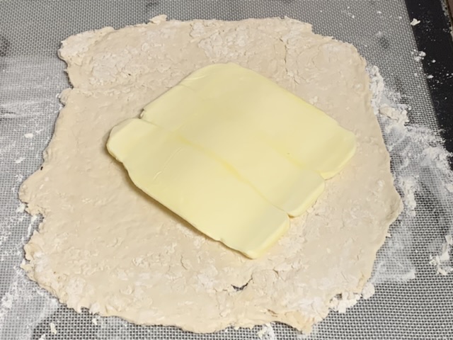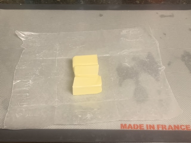 - Pendant que la pâte reste dans le frigo, faire un carré de papier sulfurisé (regarde les photos), et mettre le beurre deux dans le centre. Rouler le beurre jusqu’à obtenir un carré plat et mince.