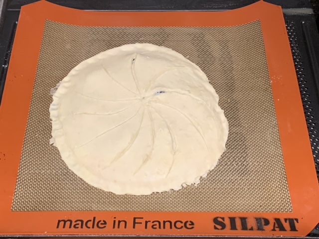 - Étirer le reste de la pâte, souder les bords à l’eau, Dorer avec un œuf entier et couper des fentes. Sucrer largement.