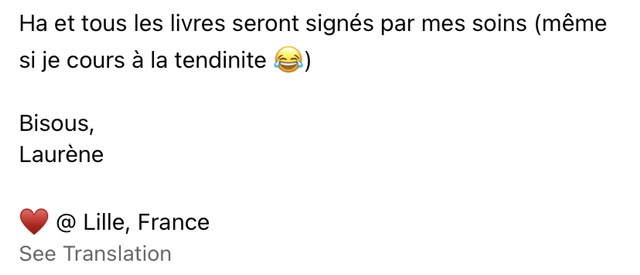 Hélas, pas de autographe. Mais je dois vous dire, à part ça, le livre est exactement ce que je m’attendais de Laurène. Voilà :