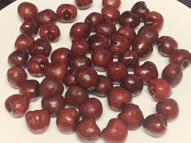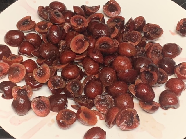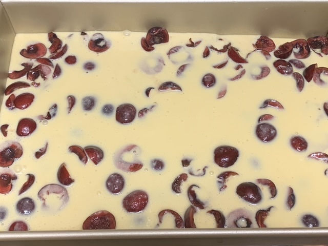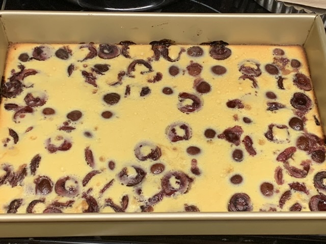 Et maintenant, le clafoutis. Je suis vraiment content avec ce dessert J’ai suivi exactement leur recette, sauf pour la levure, mais je suis pas d’accord avec deux de leurs astuces. Ils suggèrent de ne pas dénoyauter les cerises, et de mettre 100 grammes de sucre au fond du moule. C’est beaucoup de travail pour dénoyauter les cerises — j’ai eu besoin de 20 minutes pour le faire –mais je crois que vos invités préféraient garder leurs dents. Quant au sucre, il rend le fond un peu collante et difficile à démouler. Quant à la levure, ce n’était pas claire s’ils voulaient de la levure chimique ou de la levure de boulanger. J’ai vérifié une dizaine d’autres recettes, et je n’ai pas pu en trouver une autre avec de la levure, alors pas de levure dans la mienne.