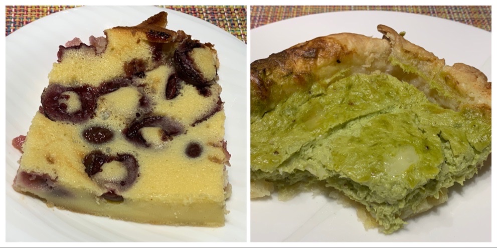 Chers lecteurs, je sais que ce post est vraiment en retard. J’étais gravement malade pendant la semaine dernière, et je suis encore malade. Pas le virus; c’est quelque chose d’intestinal. Mais je peux enfin manger alors on continue. Pour ce dîner, j’ai choisi deux plats qui sont recommandés par l’Agence de Développement Touristique de l’Aude. Voici la tarte aux asperges et le clafoutis aux cerises :