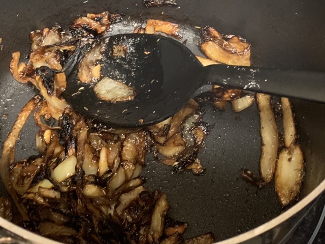- Ajouter les oignons et cuire 10 à 12 minutes jusqu’à ce qu’ils soient ramollis et commencent à dorer.