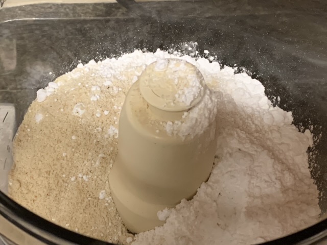 - Mettre la poudre d’amande et le sucre glace dans un robot culinaire. Ça mélange les deux mais aussi rend plus fine la poudre d’amande. On peut tamiser les deux au lieu d’utiliser le robot.