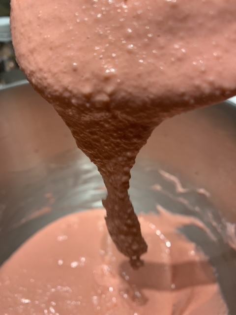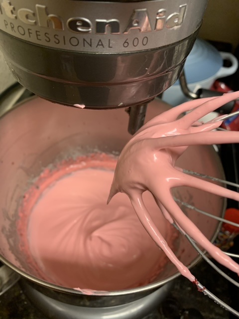 - Mettre les blancs d’œuf dans un robot pâtissier, et les battre à grande vitesse. Ajouter le sucre en poudre pendant que les œufs sont en train de battre. Ajouter quelques gouttes du gel colorant. On doit obtenir un «bec d’oiseau» comme dans la photo au-dessous.