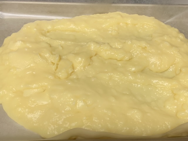 - Mettre la crème dans une plaque de cuisson couvert avec du film de contact. Couvrir la crème avec plus de film de contact.