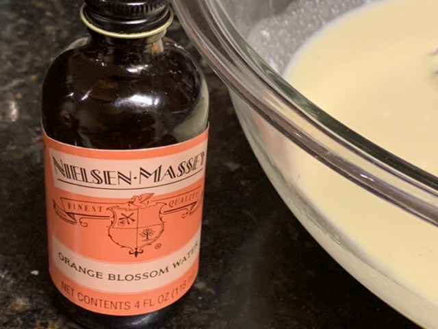 - 2 cuillères à soupe de fleur d’oranger (la version originale dit 1 dl, mais j’ai cru que c’est trop, et j’étais heureux avec les résultats)