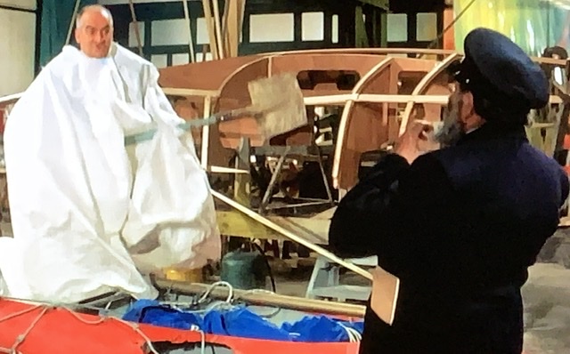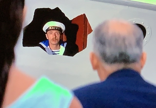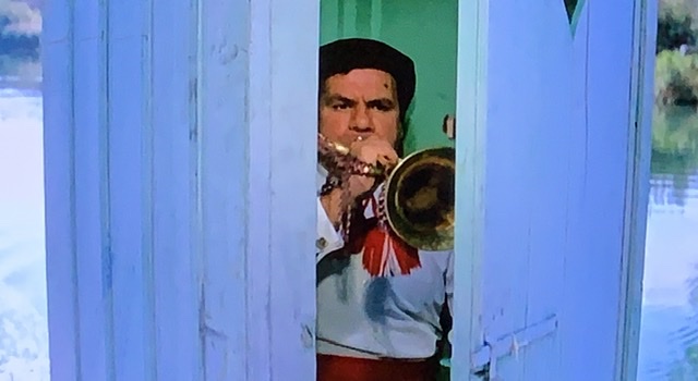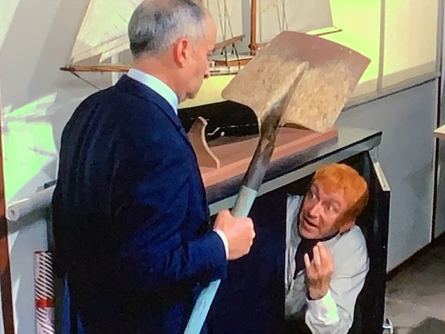 Comme d’habitude, de Funès joue un personnage intrigant et plus qu’un peu ridicule. Il est le genre d’homme qui chasserait un employé avec une pelle, puis joue à des jeux stupides avec lui, puis menace quelqu’un d’autre avec la pelle juste parce que il est encore en colère. Au fait, j’ai remarqué quelque chose d’intéressant (à moi, quand même) dans cette scène. De Funès se vouvoie avec presque tous les autres personnages dans ses films, même ses épouses (dans Le tatoué, ça fait partie du scénario), mais en ce moment, il se tutoie avec cet employé tout innocent — il dit « Qu’est-ce que tu veux ? Tu veux un coup de pelle ? » :