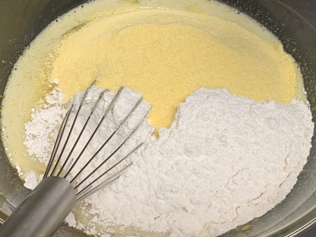 Ajouter la farine de blé et de maïs, le sel, et la levure chimique. Mélanger bien.