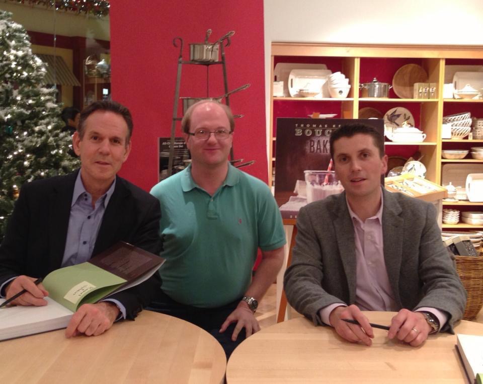 À ma part, il était une fois, j’ai rencontré le chef qui fait partie de notre version de cette histoire, Thomas Keller. Voici une photo de moi, de lui (à gauche), et de son boulanger (à droite) :
