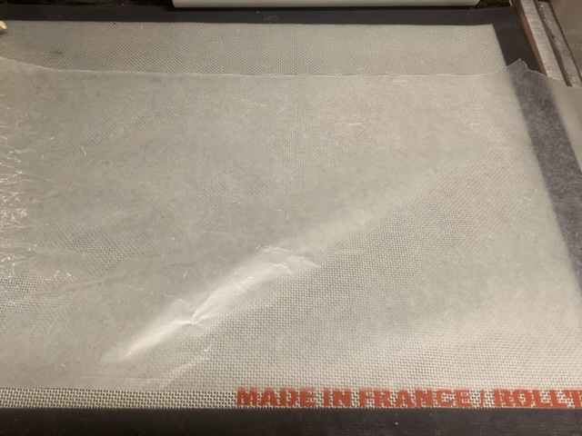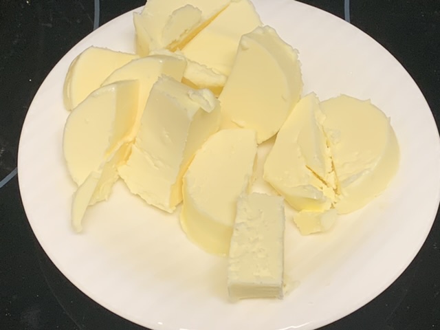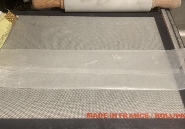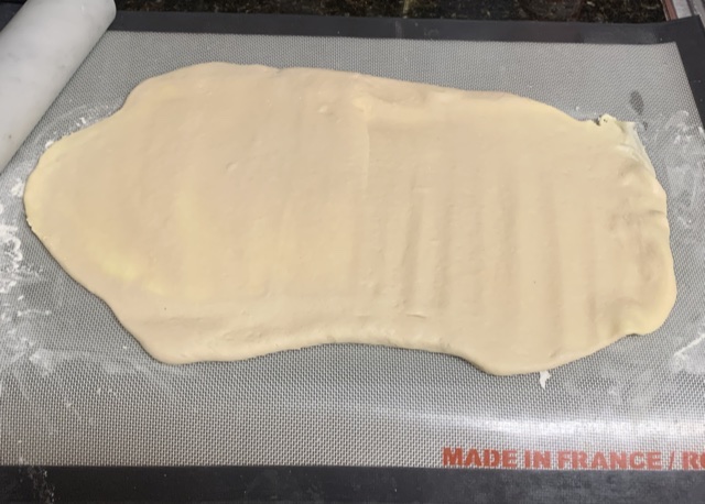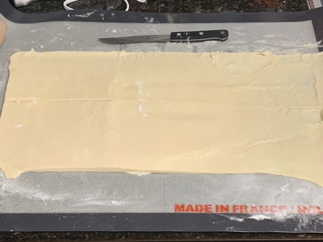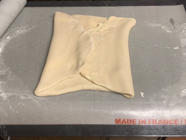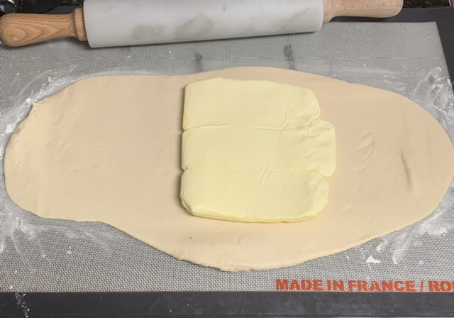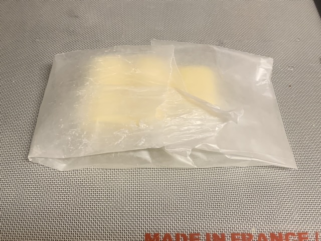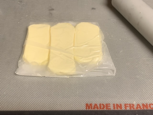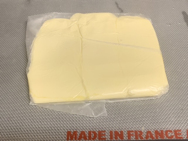 Quand on fait une pâte feuilletée, c’est vraiment important à faire un beau carré de beurre. Si on n’en fait pas un bon, l’effet des feuilles n’arrivera pas dans le produit final. C’était un peu difficile avec du beurre en cylindres, mais je l’ai plus ou moins réussi :