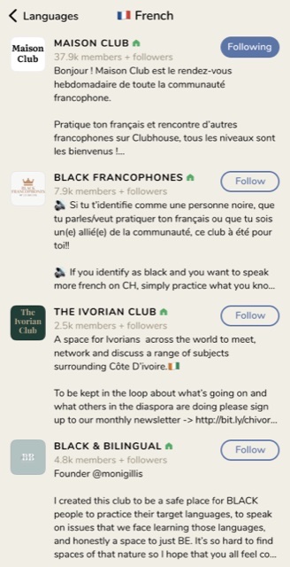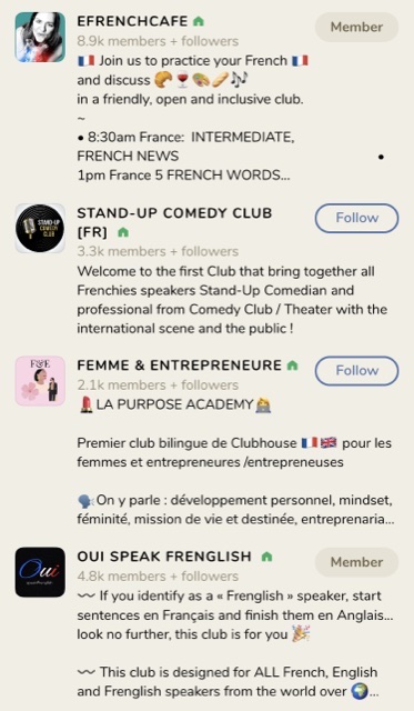 Avez-vous entendu parler de Clubhouse ? C’est un nouveau réseau social où on parle au lieu d’écrire. On a besoin d’une invitation pour rejoindre. En février, un ami m’a invité à le rejoindre sur Clubhouse. J’étais curieux s’il y avait des francophones là-bas à l’époque, alors j’ai accepté. Et voilà, tous les «clubs» qu’on pouvait rejoindre le 21 février :
