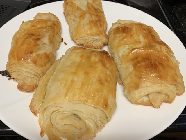 Je crois que la pâte était bien feuilletée, mais je n’ai pas encore réussi à faire dorer mes pains au chocolat. J’utilise son mélange de jaune d’œuf, de miel, et de crème liquide, mais les pains ne sont pas bien dorés. Il reste un mystère pour moi.