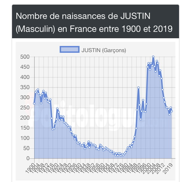 C’était un prénom presque tout inconnu en France au moment de ma naissance (1976), et j’ai un peu de peur qu’il est devenu plus populaire à cause de soit Justin Timberlake soit Justin Bieber. Mais j’ai surtout l’impression en regardant ce graphique que c’est un prénom un peu «vintage». Et je n’ai que de l’affection pour le passé, n’est-ce pas ?