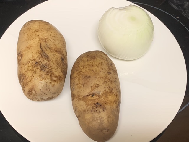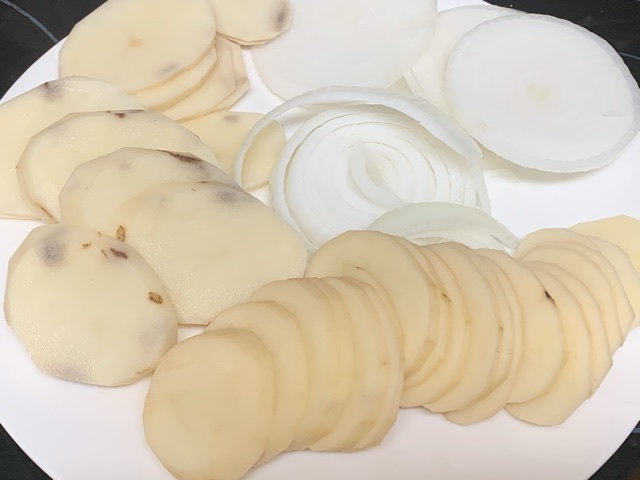 - Peler les pommes de terre et tailler des rondelles fines (pour une cuisson plus rapide et uniforme). Couper les oignons en rondelles et ciseler le persil plat, que vous aurez rincé au préalable.