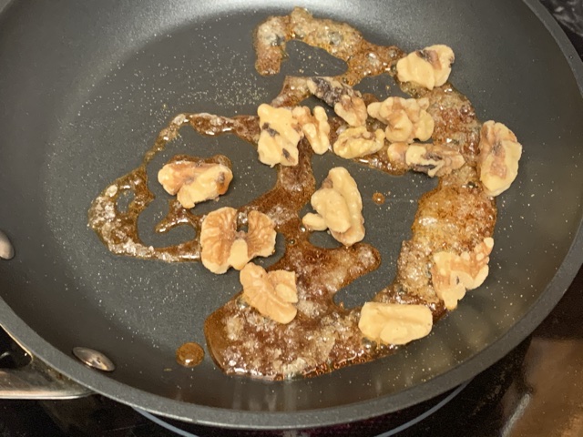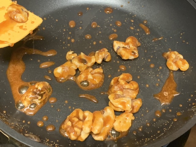 - Pour réaliser des noix caramélisées : versez une c. à s. de sucre dans une petite casserole (n’ajoutez surtout pas d’eau) et faites chauffer à feu modéré. La poudre va peu à peu se liquéfier. Ajoutez alors une autre c. à s. de sucre et ainsi de suite jusqu’à l’obtention d’un caramel doré. Versez les cerneaux de noix dedans et mélangez pour bien les enrober de caramel. Disposez-les noix caramélisées sur le gâteau.