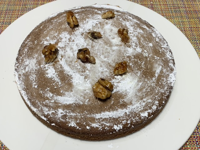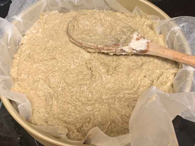 Avant de vous donner le gâteau moelleux, des astuces : 1) Cette pâte serait DIFFICILE de travailler. N’hésitez pas à utiliser un batteur plongeant, et des cuillères en métal. 2) La faveline est impossible de trouver au moins que vous habitez à côté d’un moulin. Utilisez de la farine de sarrasin. 3) J’ai fait ma propre poudre de noix ; ça n’existe pas dans nos supermarchés, mais c’est facile avec un robot. Je dois aussi cette recette au site de Berry Province.