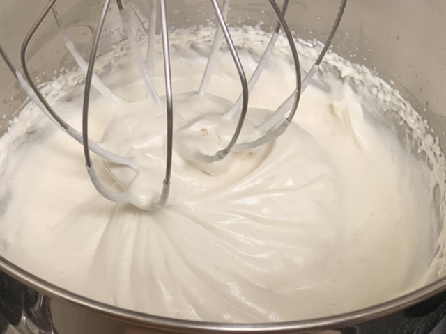 - Montez les blancs en neige bien fermes en commençant à les battre lentement. Quand ils deviennent bien blancs, incorporez en pluie le reste de sucre (50 g) jusqu’à qu’ils deviennent bien fermes.