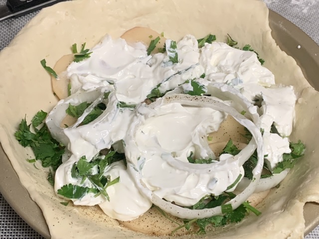 - Disposer une première couche de pommes de terre sur le fond de tarte, puis ajoutez une partie des oignons. Ajouter les herbes, saler, poivrer puis recouvrir de crème. Répéter l’opération jusqu’à ce que le niveau de pommes de terre dépasse le haut du moule. — N’utilisez pas trop de crème ; ce n’est pas important qu’on couvre complètement les pommes. Elles ne cuisineront pas assez si vous utilisez trop de crème.