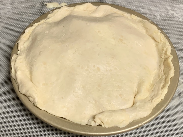 - Faire un petit trou puis insérer une cheminée (Vous pourrez utiliser une chute de papier cartonnée roulée en tube) pour que la vapeur de cuisson s’échappe un peu. Enfourner la tourte, pendant 50mn. Surveiller la cuisson des pommes de terre en plantant un couteau. — J’ai utilisé un bâton de sucette pour faire la cheminée, et il a bien fonctionné.