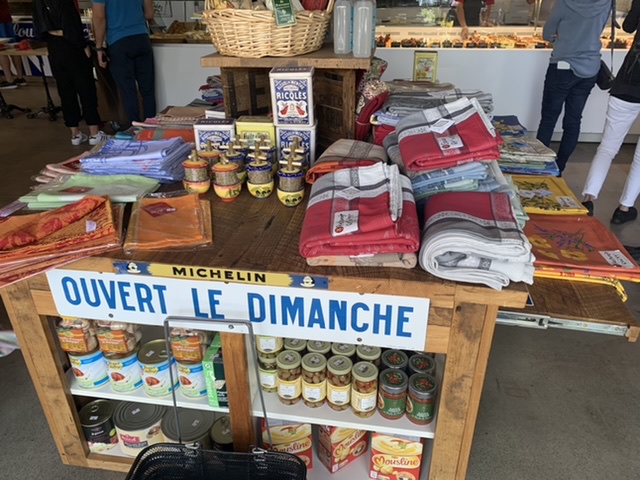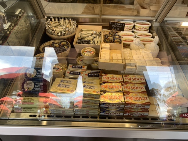 Regarde tout ce beurre — il y a plusieurs sortes de beurre de Charentes-Poitou. Il faut que je demande au caissier — combien ? 5,95 $ — un peu plus cher que mon fournisseur à Los Angeles, mais plus besoin de conduire 120 km aller-retour ! On peut trouver du beurre Président dans nos supermarchés, mais qui pensez-vous que je soutiendrai pour ces produits ? Ben oui ! Des gens gentils m’ont permis de prendre les deux dernières photos — la queue pour commander les sandwiches était beaucoup trop longue, alors je ne les ai commandés aujourd’hui. Mais voici mes achats :