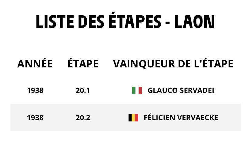 Ça me surprend un peu. J’ai donc vérifié quelques villes dans des départements sur lesquels j’ai déjà écrit. Il s’avère que c’est parfois très rare que le Tour visite — par exemple, la dernière fois où le Tour a visité Laon, la préfecture de l’Aisne, c’était en 1938 :
