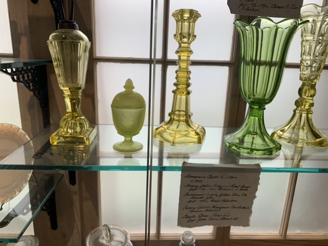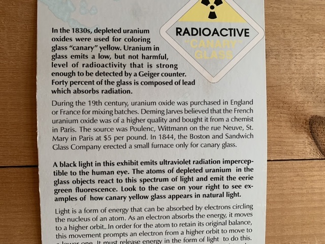 Dans les années 1830s, M. Jarves a voyagé plusieurs fois à Paris pour acheter de l’oxyde d’uranium. À l’époque, personne ne savait que le rayonnement était dangereux, et ils utilisaient ce produit chimique pour colorier le verre « canary yellow » (jaune canari). Selon le panneau ci-dessous, M. Jarves a acheté son oxyde d’uranium des chimistes Poulenc et Wittmann (plus tard connu sous le nom Rhône-Poulenc ; aujourd’hui Sanofi Aventis). Voici aussi des exemples de son verre jaune canari :