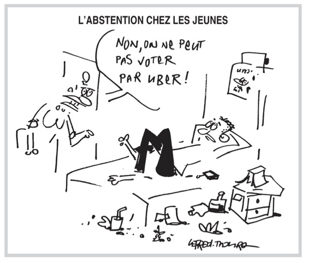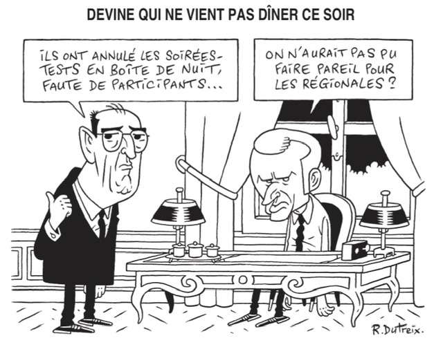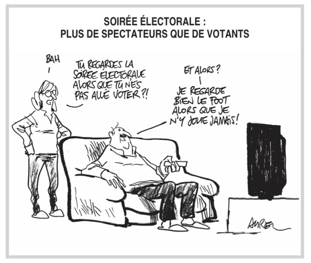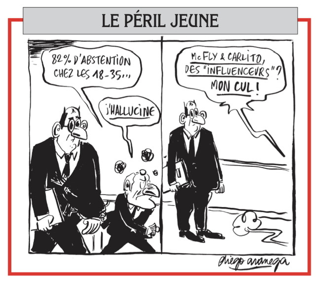Cette semaine, Le Canard Enchaîné a plein de matériel pour faire leur travail. Je comprends que les élections régionales sont partis en cacahuète, et que deux Français sur trois se sont abstenus. C’est presque comme les États-Unis quand il n’y a pas une présidentielle. Et le thème cette semaine est comment les jeunes se sont le plus abstenus.