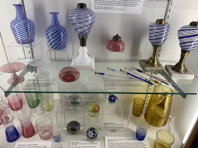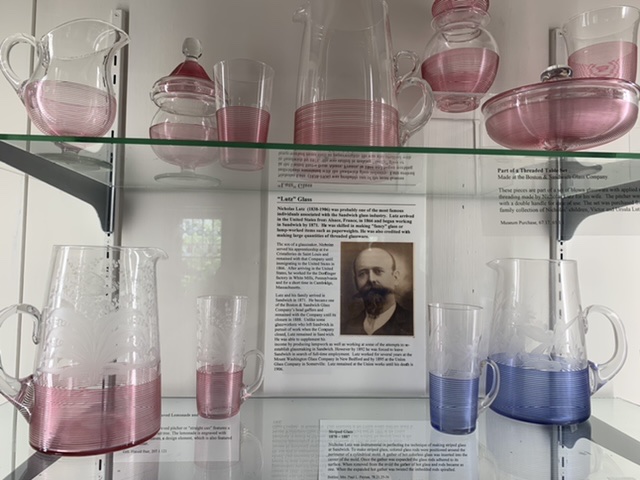 En 1871, un alsacien, Nicholas Lutz est arrivé à Sandwich pour travailler chez Boston & Sandwich. Il était expert en « threaded glass » (littéralement, verre fileté — je n’ai pas trouvé de meilleure traduction). C’est une sorte de verre décoré de rayures très fines. M. Lutz y a travaillé pendant 17 ans, jusqu’à la fermeture de l’usine. Il est resté aux États-Unis pour le reste de sa vie, jusqu’à sa mort en 1906. Toutes les œuvres ci-dessous sont fabriquées par M. Lutz.
