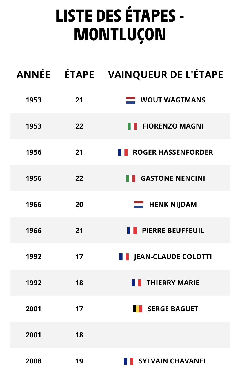 C’est la même chose avec l’Allier — le Tour de France n’a jamais visité sa préfecture, Moulins, ou Vichy depuis 1952. Il a visité Montluçon dans l’Allier beaucoup de fois, mais ça fait parfois des décennies entre les visites :