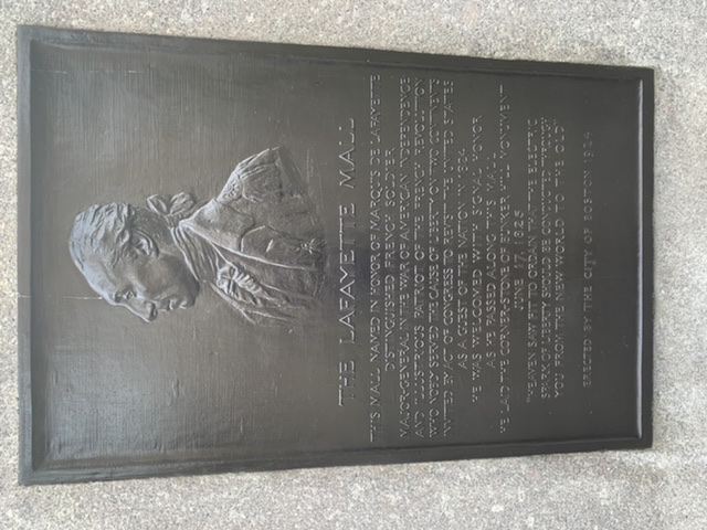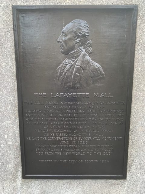 Cette place nommée en l’honneur du Marquis de Lafayette, soldat français distingué, major-général dans la Guerre d’indépendance américaine et illustre patriot de la Révolution Française…Invité officiellement par loi de Congrès de revisiter les États-Unis en 1824 en tant qu’invité de la nation, accueilli avec tous les honneurs en passant par cette place. Il a mis la première pierre du monument à Bunker Hill [première bataille à Boston].