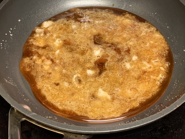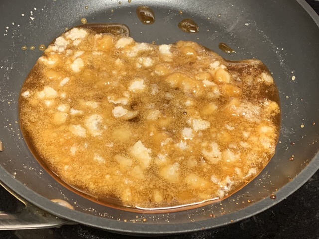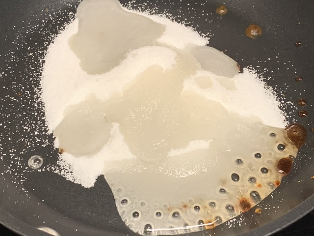 - Mettez le sucre pour caraméliser et quelques gouttes d’eau dans un moule à manqué antiadhésif. Posez-le sur feu moyen en l’inclinant régulièrement pour répartir la chaleur. — J’ai fait ça dans une poêle ensuite essayé de le transférer. C’est trop difficile. Faites le caramel dans le même moule que vous utiliserez pour la suite.