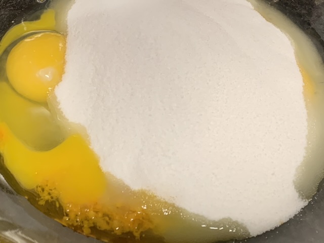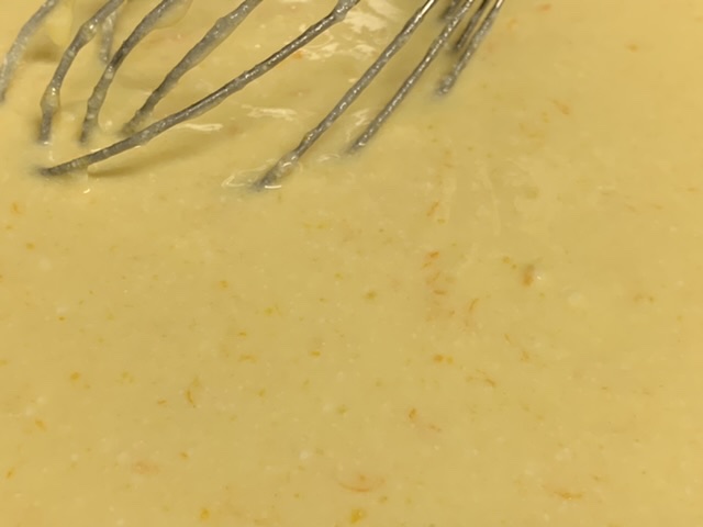 - Dans une jatte, fouettez le sucre en poudre avec les 3 jaunes et les 2 œufs entiers. Ajoutez le brocciù et le zeste, mélangez. Incorporez l’eau-de-vie et le sirop d’orgeat.