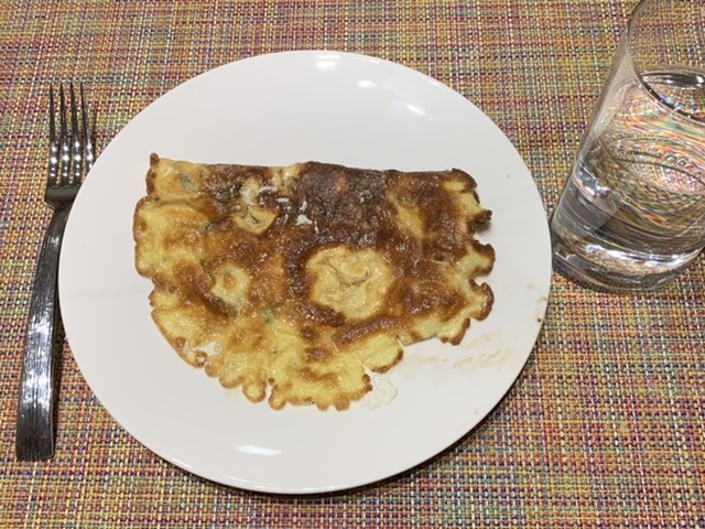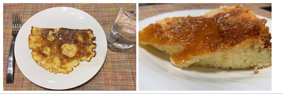 Les corses adorent le fromage brocciù, comme les aubois avec le Chaource. Alors, ce dîner est tout fait avec la ricotta, le plus proche fromage qu’on trouve dans le supermarché. (Le brocciù n’est pas disponible chez Carrefour ; ce n’est pas juste mon problème !) J’étais un peu choqué à me rendre compte qu’il n’y avait aucune recettes d’œufs ici, et je vous devais quand même quelque chose de plus facile. Alors je vous présente l’omelette au brocciù et à la menthe et ce que Dieu mange tous les jours, la fiadone :
