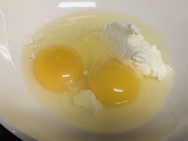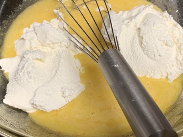 - Cassez les oeufs dans un saladier, ajoutez-y la moitié du brocciu, coupé en petits morceaux. Fouettez rapidement pour obtenir une préparation homogène.